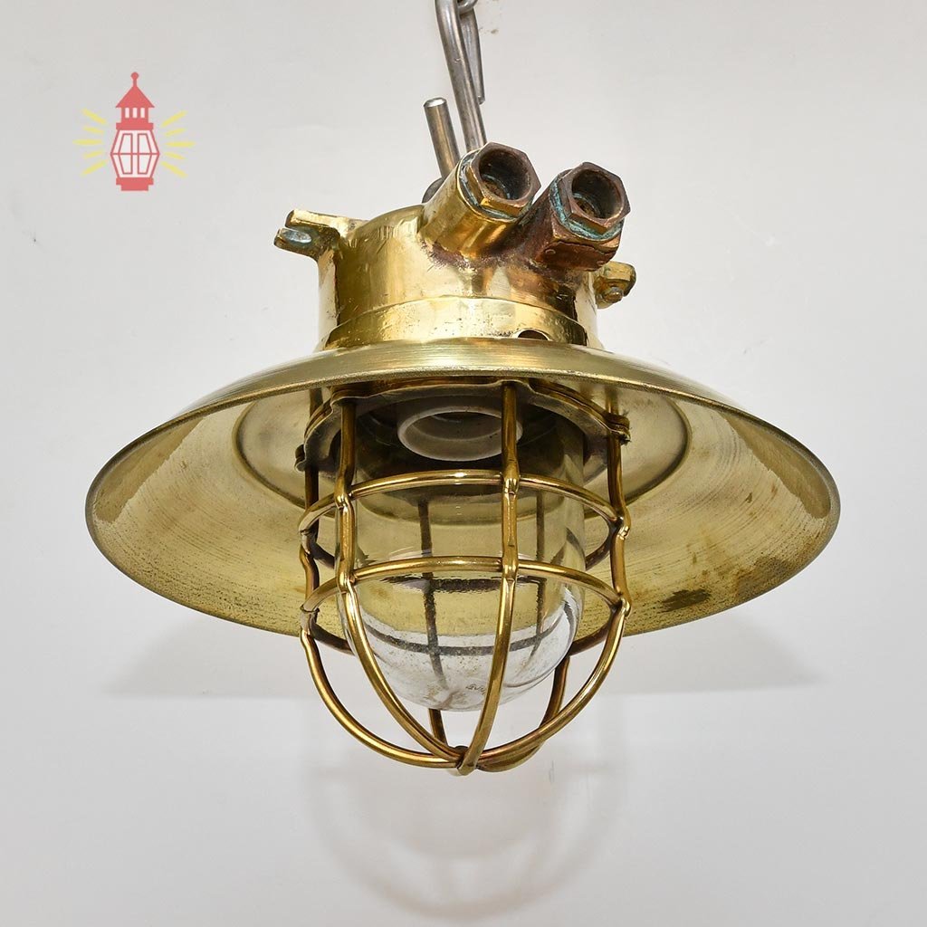 This brass hanging deck light is a real cargo spot lamp from old ships. Made from solid marine-grade brass with a large bell shade and strong cage, it’s built for tough deck conditions – reliable and bright for safe working light on ships.