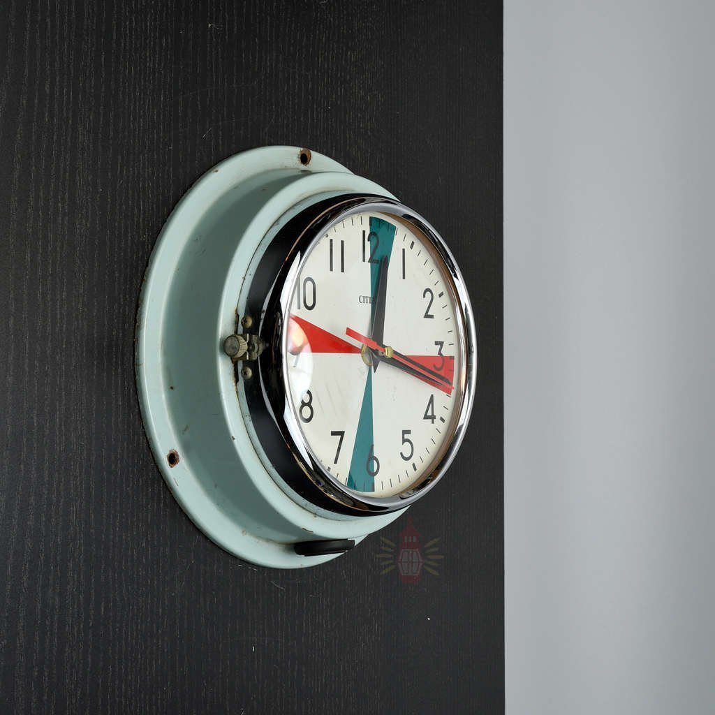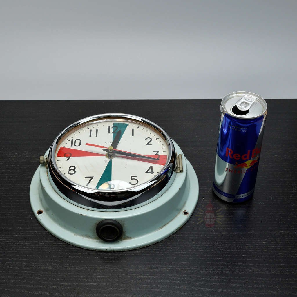 We reclaimed this Citizen clock with its colourful dial from old working ships. Radio room clocks like this helped crews mark silence periods for emergency signals. Small marks or aged spots share its unique story from real maritime life.
