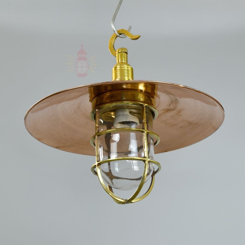 This polished brass hanging lamp with copper shade follows the design of lights used on cargo vessels. Brass and copper pendants like this lit cabins and holds on ships from past decades. The large shade directs warm light beautifully.